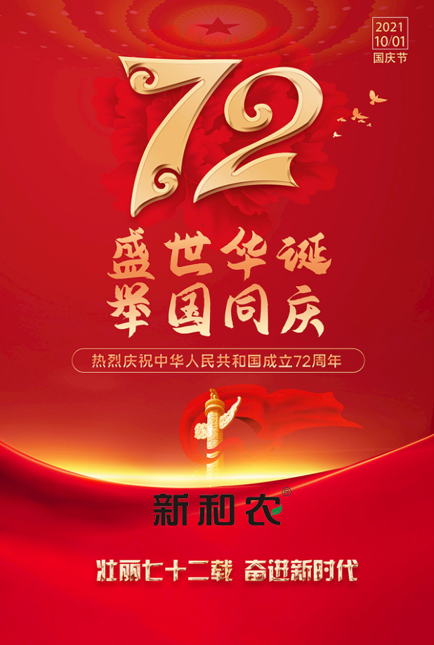 祖國是我們中華兒女的驕傲,尤其在國際局勢(shì)動(dòng)蕩、新冠疫情肆虐的今天,我們更為祖國倍感自豪。國家強(qiáng)則民強(qiáng),國家富則民富。在慶祝中華人民共和國成立72華誕的特殊時(shí)刻,全體新和農(nóng)人用牢記使命獻(xiàn)禮祖國,追求員工幸福感,追求客戶獲得感、追求社會(huì)責(zé)任感。我們將立足畜牧業(yè),發(fā)展好畜牧業(yè),為國家興旺發(fā)達(dá),為國民身體素質(zhì)、智力提高不懈努力,實(shí)現(xiàn)夢(mèng)想共同富裕。